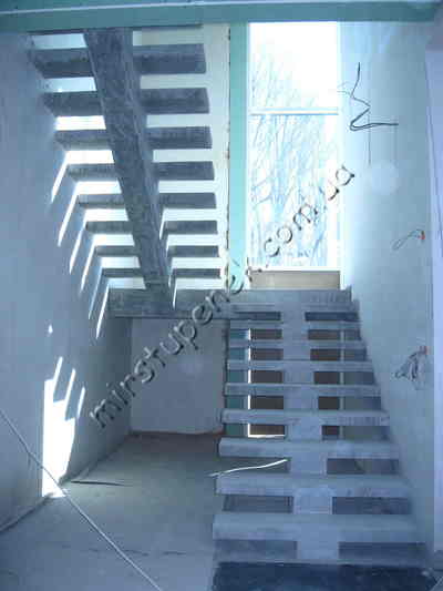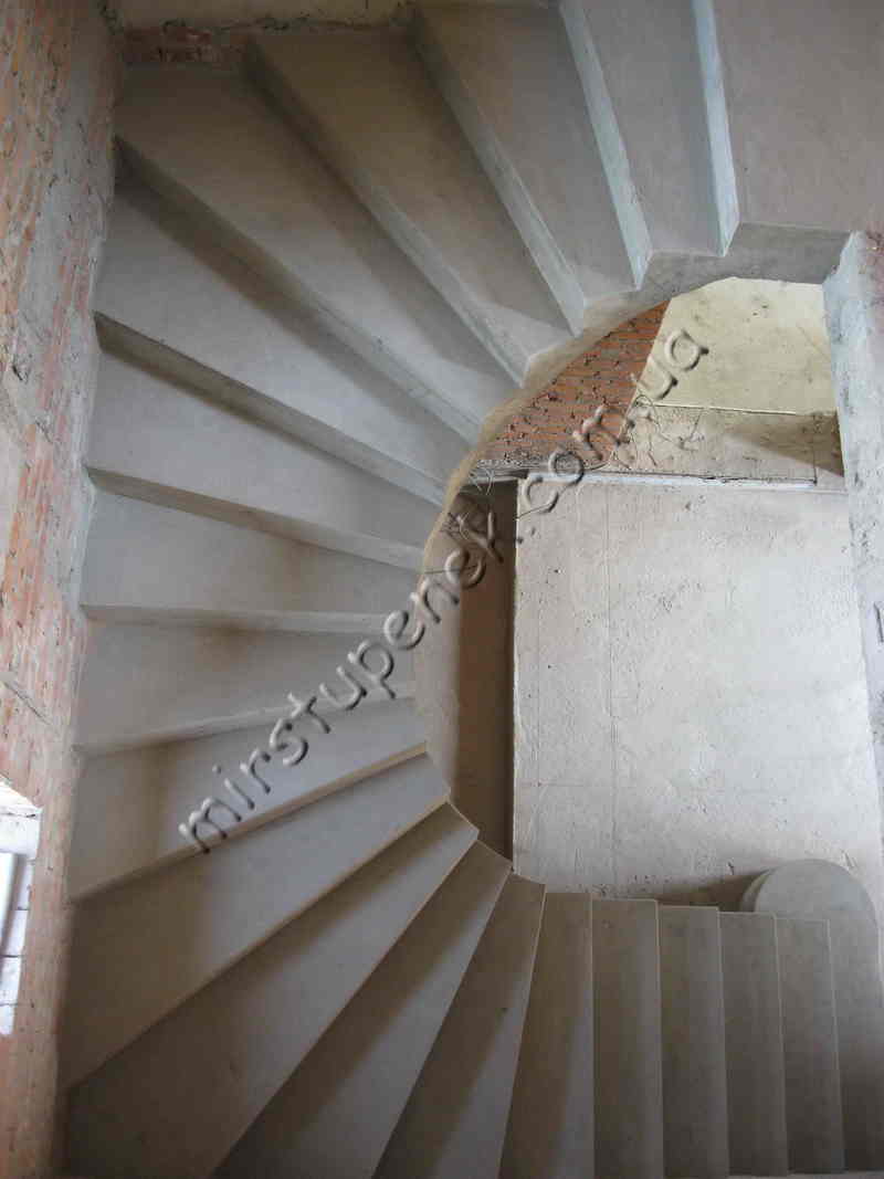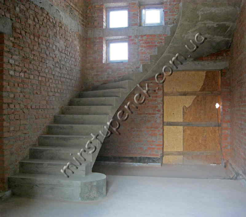 Самым универсальным материалом для строительства лестниц считается железобетон. Железобетонные изделия легко формуются и устанавливаются. Монолитные железобетонные лестницы полностью отливаются на месте в заранее изготовленной опалубке, которая определяет окончательную форму и размеры маршей. Они отличаются повышенной прочностью, долговечностью и изяществом. За счет расчета конструктивных материалов появляется возможность произвести изготовление лестниц без дополнительных опор, что позволяет её сделать более изящной и воздушной. Бетонная поверхность монолитной лестницы является в универсальном применении отделочных материалов и разнообразию применению ограждений и перил. Облицовкой бетонных монолитных лестниц может может служить дерево, ковролин, пластик, а так же может применяться мрамор, гранит и т. д.