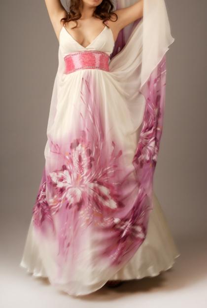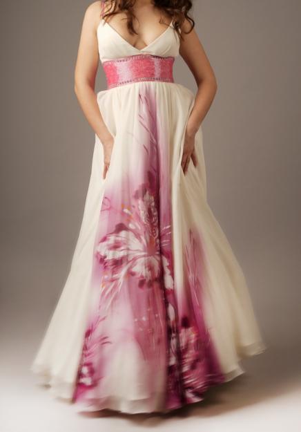 Ткань - шифон легкого кремового оттенка с роскошным принтом в виде цветка орхидеи. Пояс платья, отделяющий лиф от юбки, декорирован паетками. Бретели украшены бисером. Форма юбки платья сохраняется благодаря наличию более жесткой нижней юбки. Американский размер 2, европейский 36-38, украинский (российский) 42-44. |