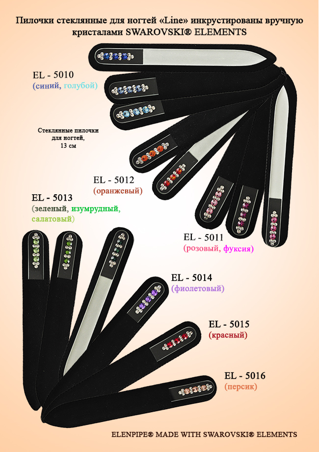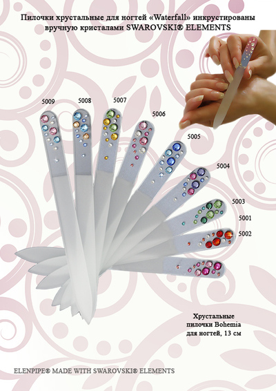 ELENPIPE тм – официальный поставщик чешских стеклянных (хрустальных) пилочек маникюрных (для ногтей), а также производитель коллекции инкрустированной SWAROVSKI ® ELEMENTS: пилочки , зеркальца, зажигалки, мундштуки , фоторамки.