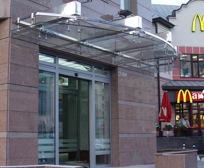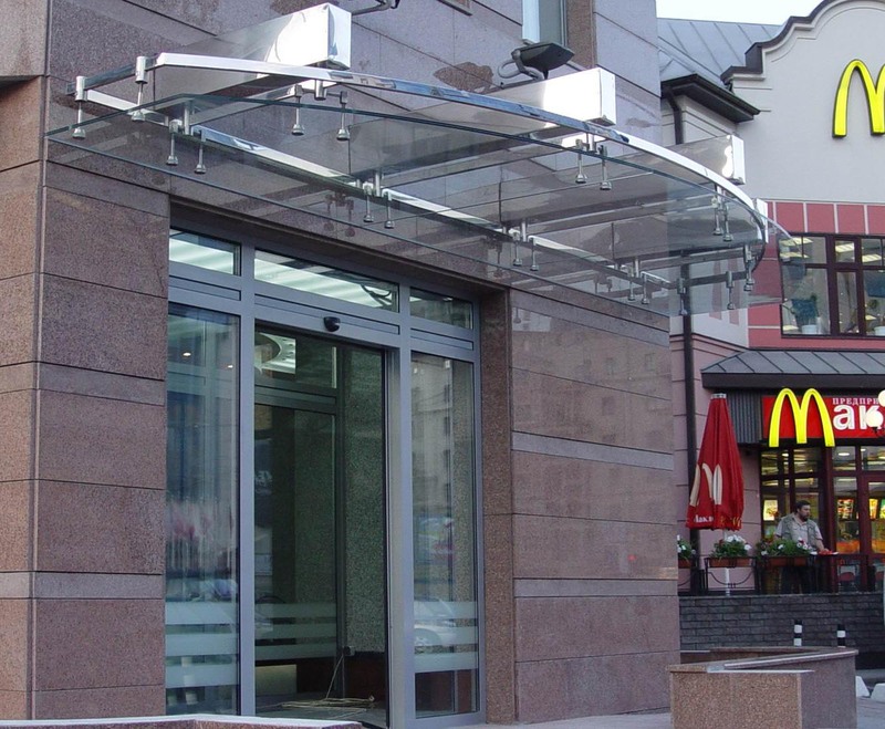 Надежная защита наружных дверей, окон и входов в подвал от влияния таких атмосферных осадков, как град, снег и дождь – это навесы и козырьки. Однако они исполняют и декоративную функцию, оригинально выделяя входную группу и подчеркивая высокий статус компании, – особенно когда навесные металлоконструкции сочетаются с другими элементами ковки (коваными ограждениями или перилами). Компания « Перила Креатив » предлагает услуги по изготовлению козырьков из нержавеющей стали с облицовкой из стекла или поликарбоната . На сегодняшний день существует довольно много дизайнерских решений козырьков различных форм. Выбор конкретного варианта зависит от архитектурного стиля фасада и тех целей, которые будут решать навесные конструкций.По нашему опыту, оптимальный вариант для абсолютного большинства зданий – металлические изделия из нержавейки с облицовкой из поликарбоната или стекла.