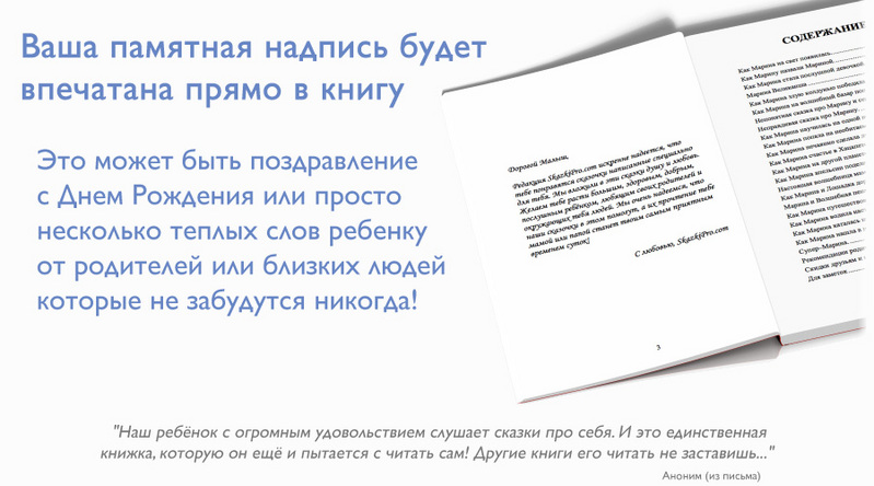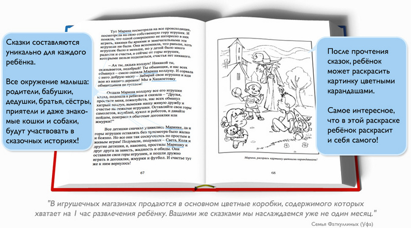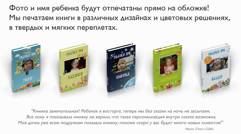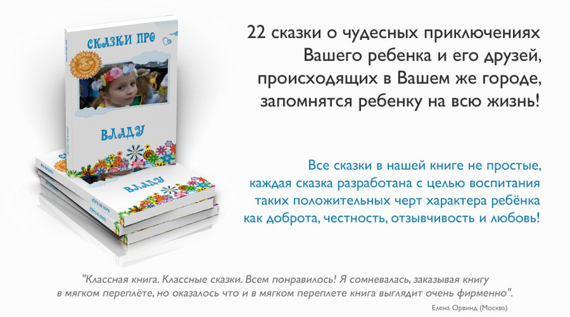 Подобного Вы не найдёте! Потому что, копий не существует! Ваш ребёнок никогда не забудет этот подарок, а Вы не пожалеете о нём! Книга создаётся только для него и про него. В сказках принимают участие все Ваши близкие и конечно, сам ребёнок. Даже любимых домашних питомцев не забудем. Картинки можно раскрашивать и за это никто не будет ругать. Не откладывайте с заказом! Нам нужно время, чтобы создать для Вас эту сказку. Все сказки очень добрые и обучающие добру, честности, отзывчивости, умению любить. Уже сейчас малыш сможет на собственном примере узнать об этом. Видеть счастливого малыша, что может быть лучше?! Используя при оформлении заказа мой код YQ5400, Вы получите скидку 10$. Всего Вам доброго! Подробности http://skazkivsem.narod.ru/