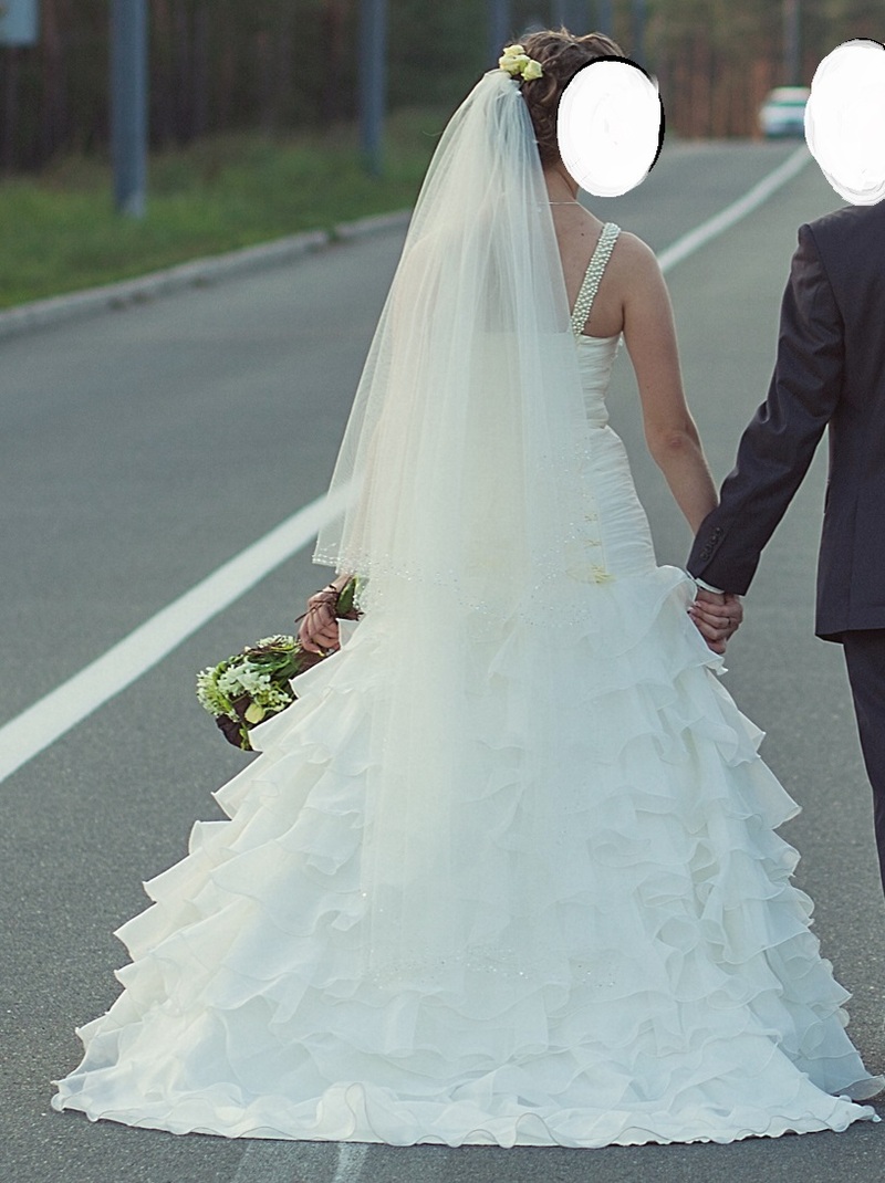 Продам свадебное платье со сьемным шлейфом. Платье в отличном состоянии, очень красивое. Цвет айвори.Цельное, корсет, сзади - шнуровка. Шлейки пришивались отдельно и вручную обшивались жемчужинками. Одевалось один раз на собственную свадьбу. Было отреставрировано в свадебном салоне. Состояние безупречное. Очень удобное. В комплекте подъюбник, кольца и чехол. Размер 42-44, рост 164-169 см |