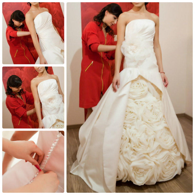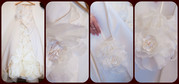 Низ юбки украшен большими крученнымии вручную розами. Сзади шлейф, который подстегивается на пуговичку. На пояс одевается воздушная декоративная роза. В том же стиле сумочка невесты. Сзади застежка на пуговички (отказались от молнии, как в оригинале, чтобы не вышло конфуза, т.к. бывают случаи, что расходятся молнии на само торжество). Есть внутренний корсаж на резинках, что фиксирует само платье на груди и талии. У меня продержалось весь день очень хорошо - на удивление, ни разу не бегала поправлять его, даже после танцев.