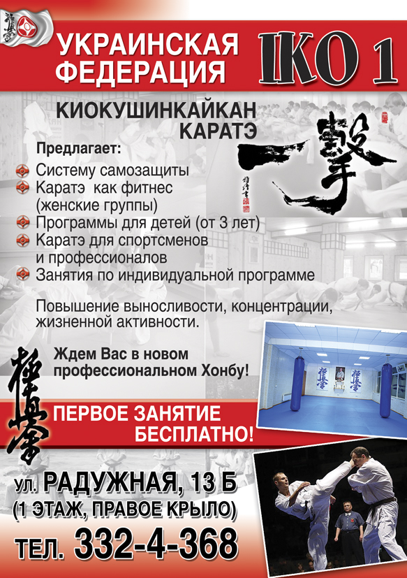 Украинская Федерация IKO 1 Киокушинкайкан каратэ Предлагает: Систему самозащиты! Карате как фитнес (женские группы)! Программы для детей от 3 лет! Каратэ для спортсменов и профессионалов! РАДУЖНАЯ,13Б (1ЭТАЖ,ПРАВОЕ КРЫЛО) ТЕЛ.332-4-368 kiev-kan@ukr.net |