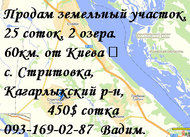 Срочно продам земельный участок земли под строительство, акт 25 соток, 60км от Киева (час езды) с. Стретовка, Кагарлыкский р-н, Киевская обл. Участок земли на жилой улице (прямоугольный), засажен деревьями, рядом газ, свет в 100-х метрах. В начале улицы два озера. В селе есть высшая педагогическая школа кобзарского искусства, садик, магазины, церковь. Удобная транспортная развязка. Продам земельный участок земли Киевская обл. - цена 450$ сотка. (093) 169-02-87 Вадим. |