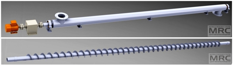 Центр Материаловедения разрабатывает, проектирует и изготавливает на заказ разные виды оборудования транспортировки и подачи материала (конвейеры, питатели) для малых и больших технологических линий любой области промышленности (химической, фармакологической, машиностроительной и др).Конвейеры и питатели являются неотъемлемой составной частью современных технологических линий, они задают и регулируют темп производственного процесса, обеспечивают его ритмичность и способствуют повышению производительности. Кроме транспортно-технологических функций, конвейеры и питатели являются основными средствами комплексной механизации и автоматизации погрузочных и разгрузочных операций.Горизонтальный шнековый конвейер функционирует следующим образом:Насыпной материал подается в загрузочное отверстие и постепенно перемещается при вращении винта в разгрузочное отверстие, где и выгружается. Материал подается в желоб и при вращении винта скользит вдоль желоба. Принцип действия винтовых конвейеров основан на использовании осевой движущей силы.