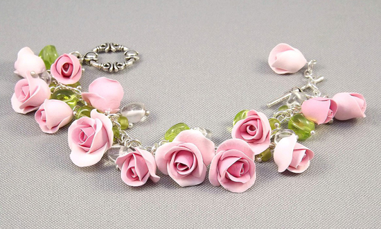 Материал: полимерная глина, бусины Цвет: нежно розовый В комплекте: браслет с розами с металлической фурнитуры, стеклянных бусин и бисера Технология: лепка из полимерной глины |
