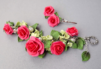 Комплект Розы и Гортензия - Браслеты, сережки, кольца