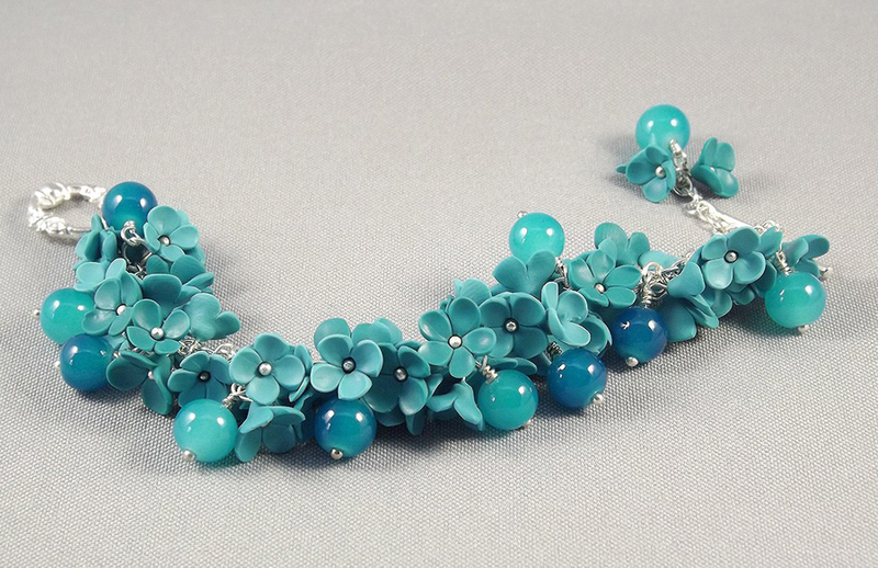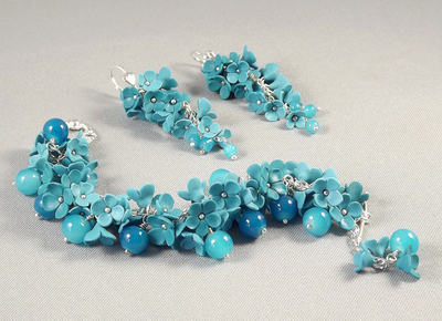 Набор Бирюзовые цветы - Браслеты, сережки, кольца