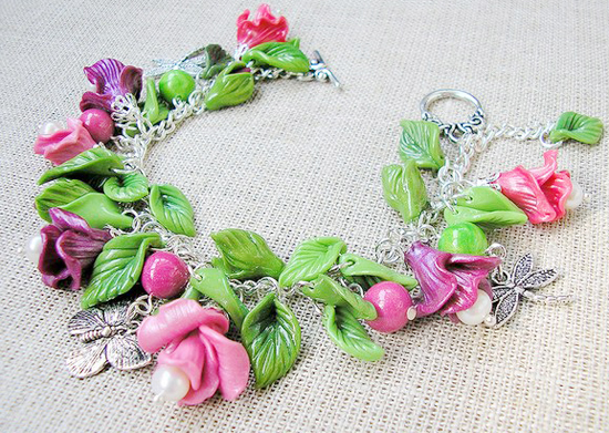 Материал: полимерная глина, жемчуг Цвет: летняя гамма В комплекте: браслет с цветочной композицией с фурнитуры и речного жемчуга Технология: лепка из полимерной глины |