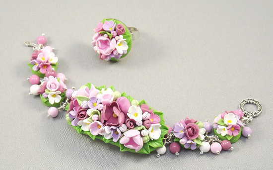 Материал: полимерная глина Цвет: летняя палитра В комплекте: браслет и кольцо (можно и поштучно) Браслет — 245 грн Кольцо — 85 грн Технология: лепка из полимерной глины |