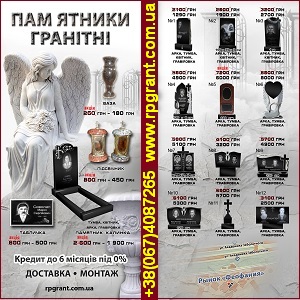 Заказать, купить памятник 2013 в Киеве. Выезд на объект БЕСПЛАТНО. Ритуальная компания «РП-ГРАНТ» предлагает: Памятники из гранита: изготовление, доставка, монтаж. Проектирование памятников, монументов. Производство ритуальных памятников, гранитных мемориальных комплексов, надгробий и изделий из гранита. Установка памятников, оградок и цветников, доставка изделий. Памятники в кредит. +38(067)4087265 Киев, ул. Заболотного, 48а Киевская обл., с. Хотов www.rpgrant.com.ua |