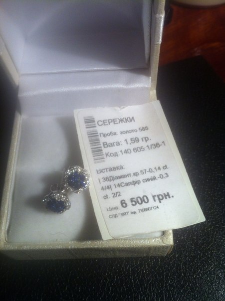 Проба:золото 585,вес1,59гр Вставка:36 диамант кр.57 -0,14 ct;4/4 14 сапфир синий - 0,3 ct Покупались за 6500 грн,возможен еще торг |