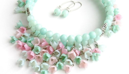 Материал: полимерная глина, агат Цвет: мятно-розовый В комплекте: колье-стойка 34 см (размер по желанию можно указать свой) и серьги из полимерной глины и бусин прессованного агата Технология: лепка из полимерной глины |