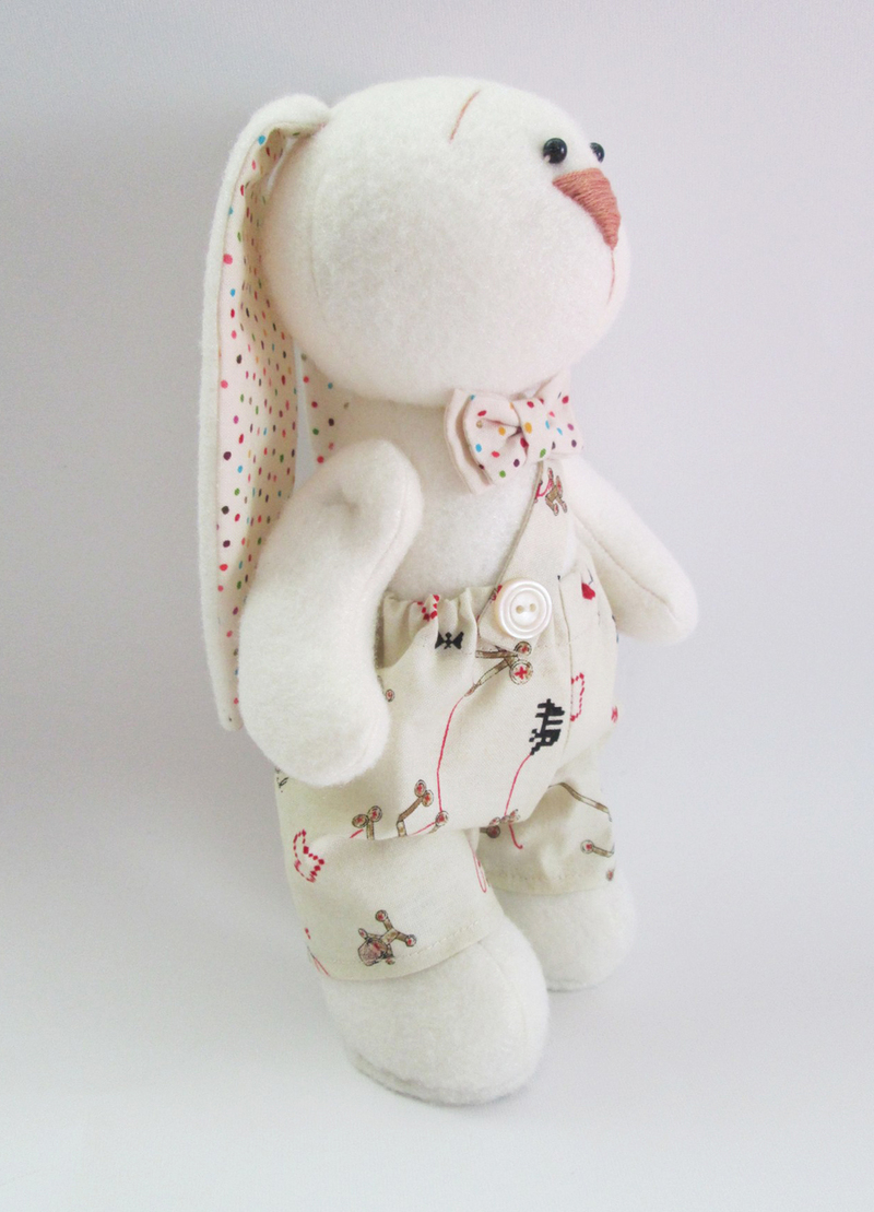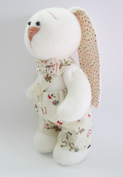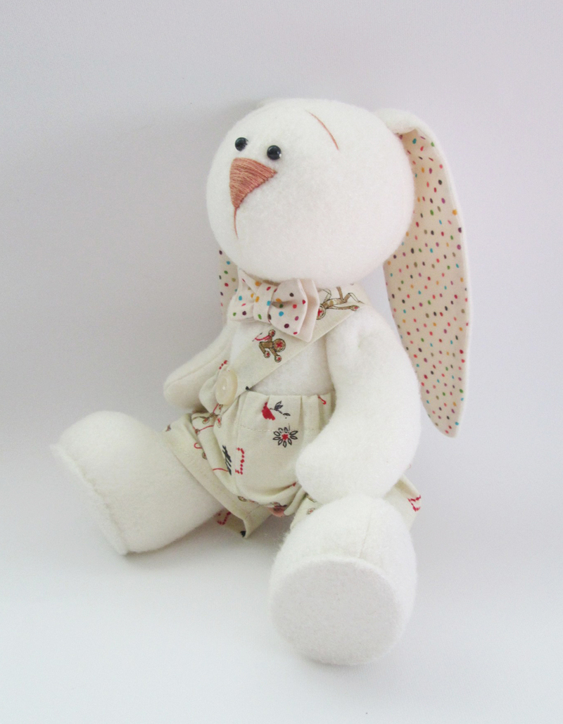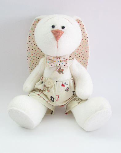 Размер: 23,5 см Цвет: белый Материал: флис, немецкий хлопок, лента органза, холлофайбер Особенности: самостоятельно стоит и сидит, ручки и ножки подвижны |