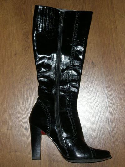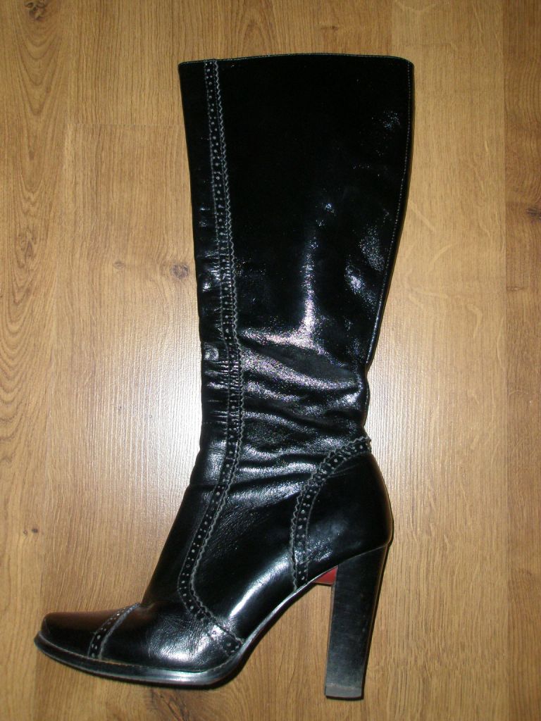 Размер: 38 Черные кожаные сапоги 38р. Замеры ширина голенища вверху 37 см, в районе косточки 25 см, длинна по стельке 26 см. Высокий устойчивый каблук, удобная колодка. Б/у в отличном состоянии (одеты пару раз). Фирменная коробка + дополнительные набойки. Доставка по Киеву бесплатная. |