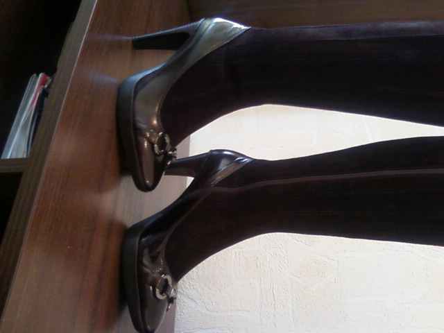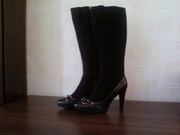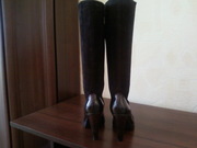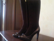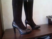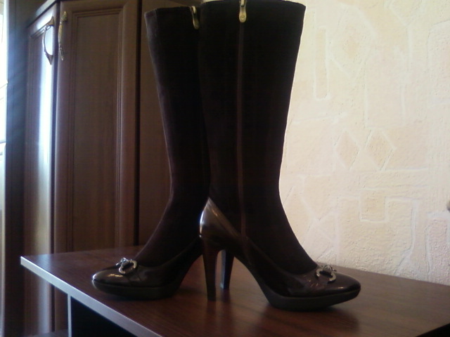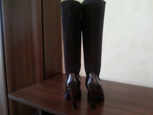 Продам новые модные демисезонные сапоги, р-р 39, полностью из натуральной кожи (низ сапог - глянцевая кожа, голенище - замшевая),цвета тёмного шоколада. каблук ок. 9 см, но благодаря высоте подошвы - 2 СМ, это совсем не ощущается, в них очень удобно и устойчиво и ноги в них не будут никогда мёрзнуть. Они чётко соответствуют своему 39 размеру за счёт округлого носка (постельке 25-25,2 см). Объём голенища в самом широком месте примерно 39, но в связи с тем, что замшевые клинья голенищ сапог соединяет прочный эластичный материал, они как сапоги-чулки комфортно ложатся по ноге и могут немного изменять свой объём в зависимости от толщины колгот или брюк. По поводу ширины ноги - тоже самое - не имеет значения: можно и на среднюю и на широкую подойдёт.