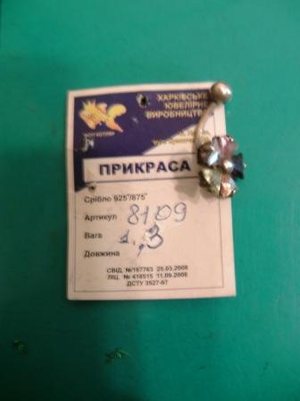 красивущая серьга для пирсинга с фианитами, серебро 925. |