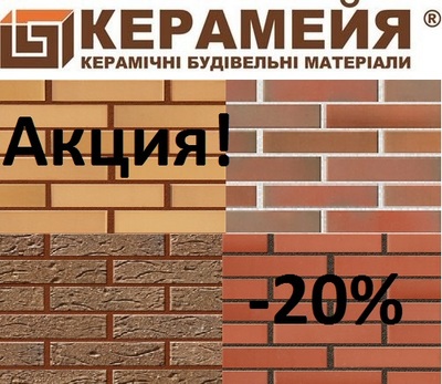 Внимание! -20% на весь ассортимент клинкерного кирпича завода "Керамейя" г.Сумы Клинкерный кирпич-это кирпич высокой прочности, с низким водопоглащением (5%) и отличной морозостойкостью! Широкий ассортимент, соответствие цена-качество и гарантия 100 лет – это все о клинкерном кирпиче завода «Керамея»! Клинкер не боится дождя, сильного ветра или большой нагрузки. Цена от 3, 99 грн./шт. Облицовка фасадов и заборов профессиональными каменщиками от 3, 50грн./шт. Доставка по всей Украине!!! Звоните прямо сейчас! Акция действует до 31 Декабря 2013 года. |