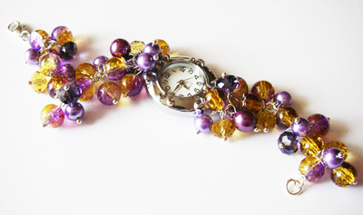 Материал: хрустальные бусины Цвет: фиолетово-желтая гамма В комплекте: часы с кварцевым механизмом изготовлены из хрустальных, стеклянных бусин и бусин под жемчуг с длиной браслета 18 см |