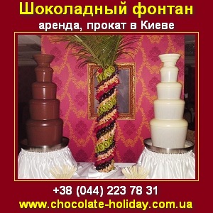 Организация мероприятий, праздники 2013/2014 Компания «Шоколадный праздник» предлагает: Аренда прокат - шоколадные фонтаны. Шоколадные фонтаны в аренду - Ваше незабываемое событие! Шоколадный фонтан украсит любое торжество: день рождения, свадьбу, детский праздник или корпоративную вечеринку. Шоколадный фонтан - доставим, оформим и запустим. Ирина +38(044)2237831 +38(093)4192734 www.chocolate-holiday.com.ua |