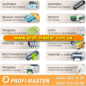 Ремонт оргтехники в Киеве и обл. Заправка 2013 лазерных картриджей в Киеве. Компания Profi-Master предлагает: Восстановление лазерных картриджей. Заправка лазерных картриджей. Заправка струйных картриджей. Продажа расходных материалов. Продажа оргтехники офисной техники. Ремонт оргтехники офисной техники. Цены ниже рыночных. +38(044)3621535 +38(044)3831539 www.profi-master.com.ua |