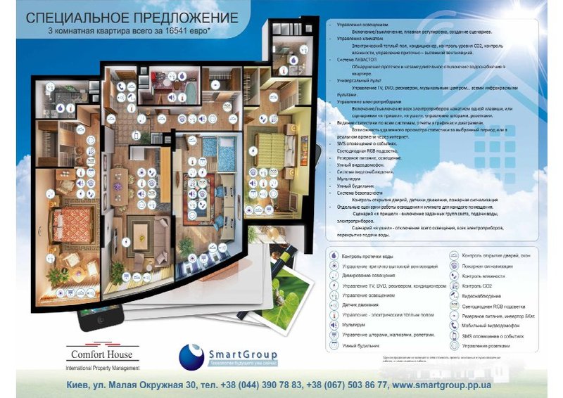 Компания SmartGroup занимается установкой систем автоматизации (система «Умный дом», кондиционирования и вентиляции, видеонаблюдения и домофоны, электро замки, СКУД и спутниковые системы) помещений (таких как квартиры, коттеджи, офисы или отели).