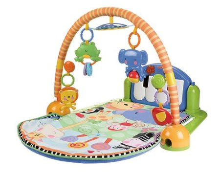 Включает 5 игрушек, которые можно перемещать. Дуга передвигается вниз для игр на животике; малыш может играть сидя и разыгрывать целый концерт на пианино! Требуются 3 AA батарейки.
