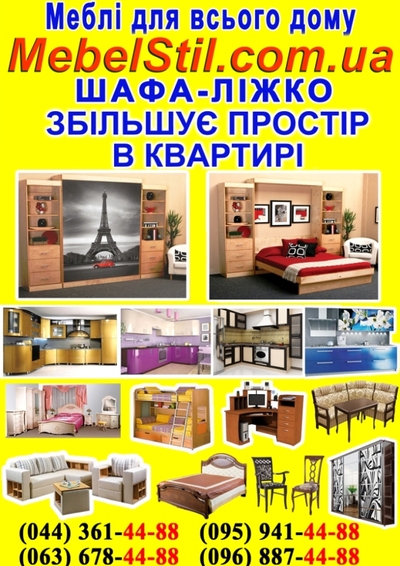 МебельСтиль - продажа мебели в Киеве, купить шкаф-кровать, кухни, прихожие, компьютерные столы, мебель для спальни. Компания МебельStil проводит акцию и предлагает всем принять участие в розыгрыше путёвки в Париж на двоих. В нашей компании можно приобрести: 1. Шкаф-кровать купить в: Днепропетровске, Донецке, Запорожье, Полтаве, Харькове, Киеве, Одессе, Луганске, Севастополе, Николаеве, Черкассах, Львове, Сумах, Кировограде, Чернигове, Ивано-Франковске, Волынске, Ровне, Виннице, Херсоне, Хмельницке, Житомире, Закарпатьи, Черновцах, Тернополе. 2. Кухня Квадро комби по цене всего 965 грн. п.м. Мы будем очень рады, если Вы окажетесь в числе наших заказчиков! Наши контакты: http://mebelstil.com.ua г. Киев м. Вокзальная ул. Лукашевича, 15а ТЦ "Европорт", 3-й этаж |
