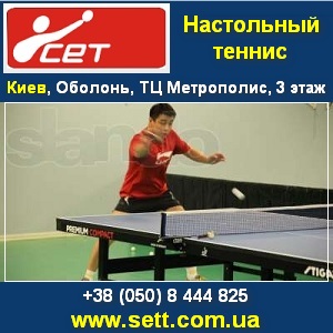 Семейный отдых, досуг и Спорт секции в Киеве. Клуб настольного тенниса СЕТ предлагает: Настольный теннис от 40 грн. Настольный теннис на Оболони - с семьей, друзьями, коллегами. Настольный теннис - есть абонементы, секции, спаринг партнеры и тренера. Столы Стига. Любительские турниры по Сб и Вс. Возможно бронирование зала для мероприятий. Всю бронь по телефону. Александр +38(050)8444825 Киев, ул. Малиновского, 12а М. Оболонь, ТЦ Метрополис, 3 этаж www.sett.com.ua |