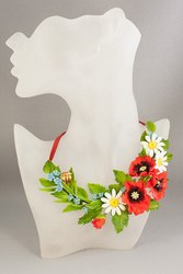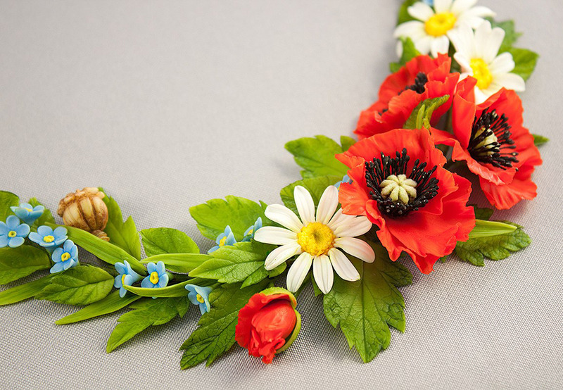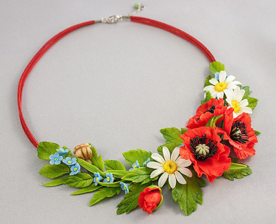 Материал: холодный фарфор Цвет: яркая гамма В комплекте: колье в украинском стиле с полевых цветов из холодного фарфора, металлической фурнитуры, шнура под замшу. Размер цветов: маки до 4 см, ромашки до 3 см Технология: лепка из холодного фарфора |