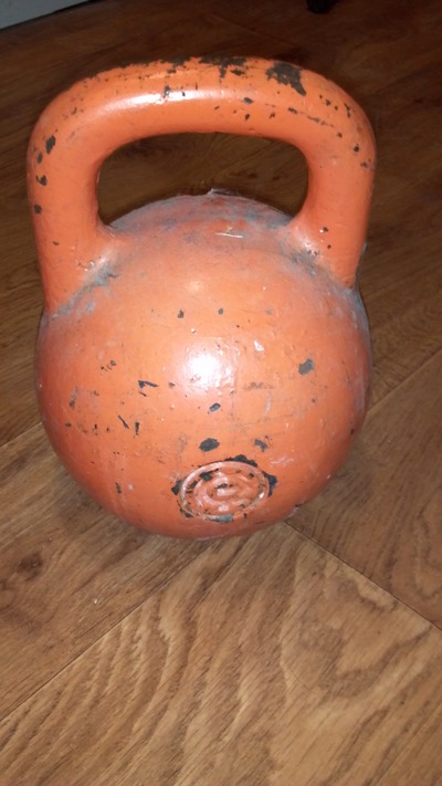 гиря 16 килограм.оранжевого цвета.советских времен.чугунная. |