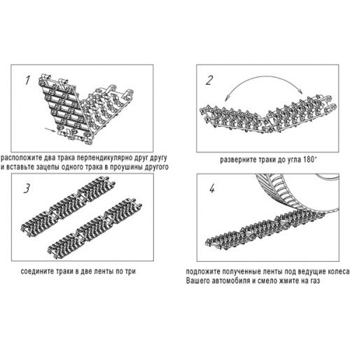 Благодаря этому устройство имеет массу всего лишь 2 кг и занимает место в багажнике, соизмеримое с автомобильной аптечкой. Воспользоваться Антибуксом просто. Достаточно соединить траки в нужном сочетании и положить под буксующие колеса.