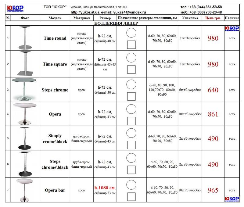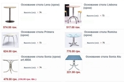 Основания под столы (h-73): Основание стола Bistro (хром), Основание стола Cafe (хром), Основание стола Dona 3 (хром), Основание стола Dona 4 (хром), Основание стола Elise art.414 (хром), Основание стола Elise art.449 (хром), Основание стола Igor, Основание стола Igor (хром),Основание стола Kaja (хром), Основание стола Karina, Основание стола Karina Alu, Основание стола Karina (хром), Основание стола Lena (хром), Основание стола Lisbona (хром), Основание стола Primera (хром), Основание стола Romina (хром), Основание стола Sonia (хром) art.480A, Основание стола Sonia Alu, Основание стола Tracy (хром), Основание стола Tracy duo (хром), Основание стола Trieste TM (хром), Основание стола 302, Основание стола 302CC, Основание стола 305, Основание стола 305CC, Основание стола 33940CR, Основание стола 34040C, Основание стола Bistrot 4101, Основание стола Bistrot 4102, Основание стола Dream, Основание стола Impero, Основание стола Impero, Основание стола Inox 4402, Основание стола Inox 4411, Основание стола Inox 4421, Основание стола Inox 4475, Основание стола Kaja Alu, Основание стола Meme5, Основание стола Ottawa, Основание стола Pinacolada Chrome, Основание стола Quadra, Основание стола Quadra, Основание стола Rocky, Основание стола Rozanna Chrome, Основание стола Rozanna Duo Chrome, Основание стола Tiramisu Alu, Основание стола Tiramisu chrom, Основание стола Tiramisu Duo Alu, Tiramisu Duo chrom. Основания под высокие столы (h 110): Основание стола Bistro (хром), Основание стола Lisbona, Основание стола 302HCC, Основание стола 305HCC, Основание стола 33940HCR, Основание стола Bistrot, Основание стола Impero, Основание стола Inox 4406, Основание стола Inox 4414, Основание стола Inox 4424, Основание стола Wiktor Chrome 1100. Базы для столов барных: база стола Дункан, база стола Зингер, база стола Сенатор, база стола Спартак, база стола Спартак Лайт, высокая база стола Спартак H-1080мм, база стола Триола.