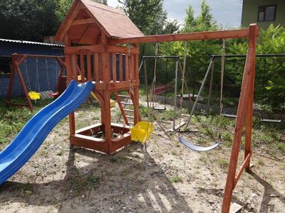 В состав входит: домик с песочницей, горка спуск, качеля "басик", качеля "стандарт".