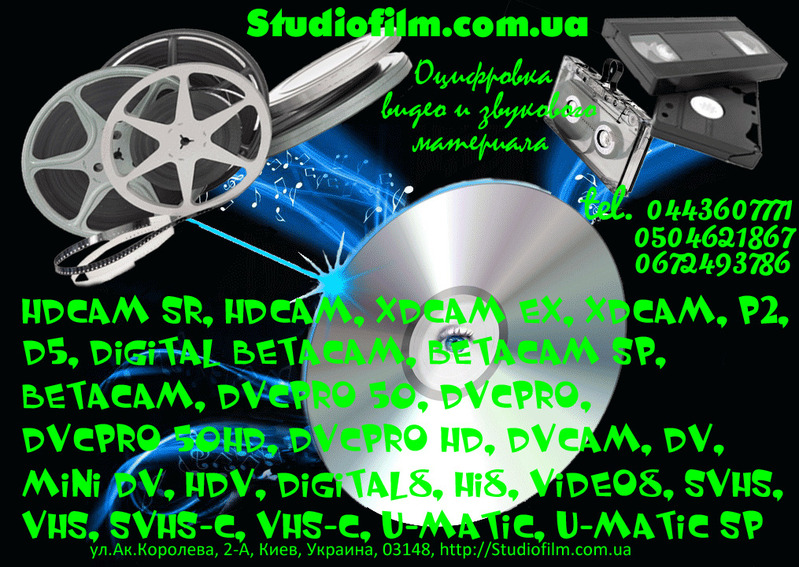 Студия Studiofilm предлагает услуги профессиональной свадебной видеосъемки, Love Story, венчание, детские праздники, крестины, интервью, презентации, документальное кино, монтаж в Adobe Primiere Pro CS 5.5 Master различных жанров и направлений. Мы находимся в Киеве, работаем по всей Украине и за рубежом. Мы гарантируем творческий и индивидуальный подход к каждому клиенту. Съемка производится исключительно профессиональным оборудованием. Мы гарантируем безупречное качество. Каждый новый проект заряжает и увлекает нас, потому что мы хотим и любим делать нашу работу, которой будут гордиться как наши клиенты, так и мы сами. Вы можете быть уверены на все сто-результат будет настолько качественным и профессиональным, настолько это вообще возможно. Студия технической перезаписи выполнит работы по высококачественному переводу видео и звукового материала из одного формата в другой. Принимаем материалы на любых форматах аудиовизуальной записи: HDCAM SR, HDCAM, D5, Digital Betacam, Betacam SP, BETACAM, DVCPRO 50, DVCPRO, DVCAM, DV, HDV, mini DV, Digital8, SVHS, VHS, VHS-C, Hi8, U-Matic SP, U-Matic, Video8, DVD-Video, DAT, CD, Mini Disc, рулоны магнитной ленты 1/4(6,3мм), грампластинки, кинопленку 8мм, компакт-кассеты и.т.д. Мы имеем полные линейки профессионального оборудования для работы в системах PAL(625/50) и NTSC(525/60), а также Full HD/CineAlta 720p, 1080i, 1080p, 50/60