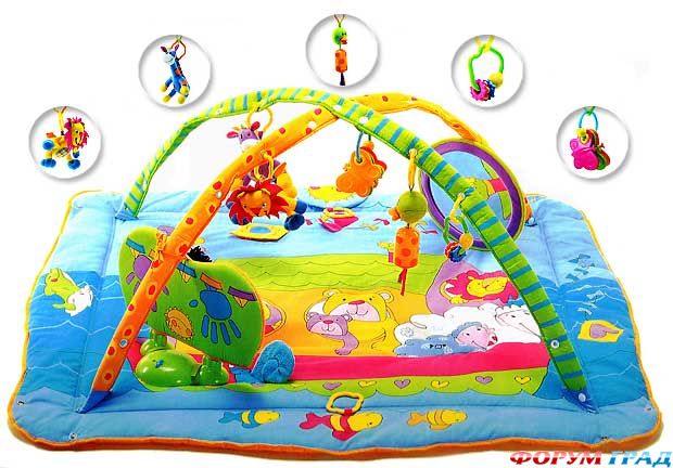 Tiny Love есть 2 дуги: оранжевая и зеленая. На дугах висят погремушки (солнышко, бабочки, разноцветные колечка, гусь с колокольчиком, мягкие львенок и жирафа) Развивающий коврик имеет зеркальце. Ребенок будет лежать на животике и смотреть в зеркало. Ему будет интересно видеть свое отражение и это заставит его увереннее держать голову. Уникальность этого коврика – игровая панель, которая имеет 2 режима:
