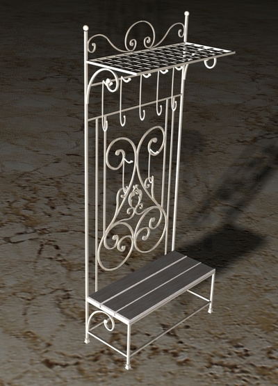 Кованая вешалка для прихожей. Стандартные размеры : высота – 2,20 м, ширина – 75 см., глубина – 40 см. Сиденье – тонированное дерево. Тонировка кованой части – старая бронза, старое серебро, белый антик. Размеры и конфигурация вешалки могут быть изменены по пожеланию покупателя. |