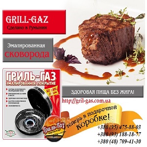 Представительство в Украине предлагает: Сковорода Гриль-Газ эмалированная в ПОДАРОЧНОЙ упаковке 170 грн. П-во Румыния, товар сертифицирован. Всего 20-30 мин: - курица с хрустящей корочкой; - первоклассный шашлык; - овощи, шашлык, кебаб; - печеная картошка; - рыба на гриле. ОПТОМ: от 2 шт. - 150 грн./ед. от 10 шт. - 140 грн./ед. Готовим вкусную, здоровую и полезную пищу без масла и жира! Марина +38(093)1881877 +38(095)4758803 www.gril-gas.com.ua |