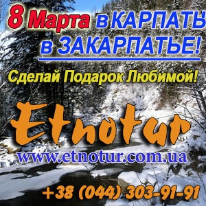 Праздничный тур в Берегово на 8 марта 2014 с посещением Мукачево, Ужгорода и Львова. Из Киева 07.03.14 по 11.03.14 - 1280 грн. Ма гия Закарпатья с посещением Синевира, Мукачева, водопада Шипота. Из Киева 07.03.14 по 11.03.14 - 1250 грн. Проживание, проезд, питание, экскурсионная программа. Подробные программы туров 8 марта, туры выходного дня в Карпаты и Закарпатье на нашем сайте. Туроператор ЭТНОТУР +38(044)3039191 +38(067)2253399 Киев, ул. Жилянская, 7-Б www.etnotur.com.ua |