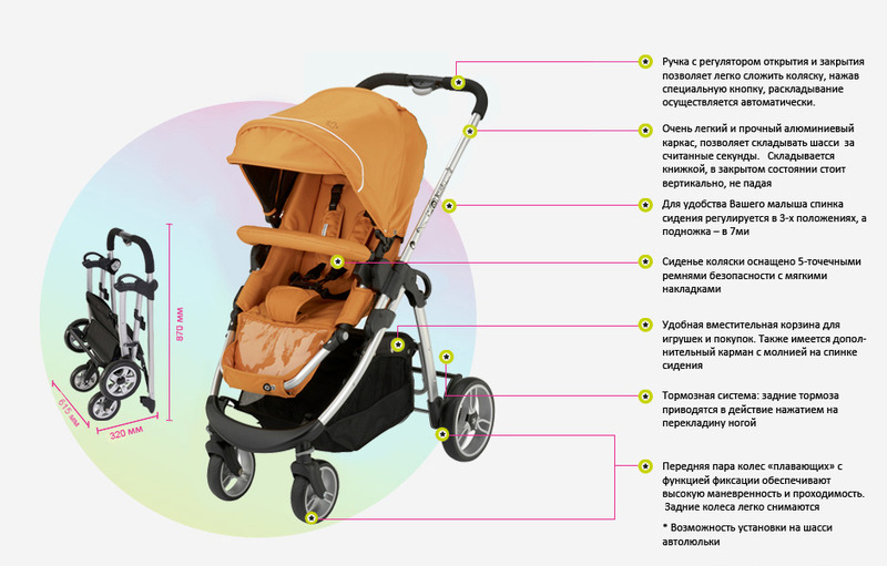 Люлька удобно складывается, не занимает много места. Кап удобный, не огромный, ветер не задувает. Люльку можно переносить в руках. Придя домой вы просто отстегиваете люльку, а шасси складываете, оно не занимает много места, в доме нет привычной грязи от постоянно стоящей коляски. Шасси умещается в любой багажник. Колеса при необходимости отстегиваются нажатием на кнопочку.
