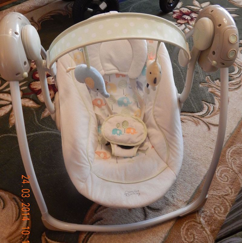 Простое и компактное кресло-качели. Удобное сидение, плавная регуляция скоростей, музыка и дуга с мягкими игрушками. Кресло не занимает много места в квартире и компактно складывается. Bright Starts Comfort & Harmony подойдет для ребенка с рождения до года (11 кг).