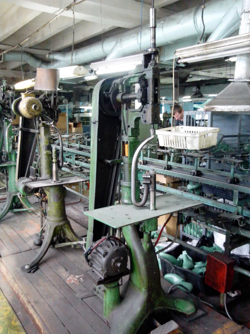 Машина для прикрепления подошвы по всему периметру с помощью гвоздей. Гвоздь проходит через подошву, затяжную кромку заготовки и стельку, затем загибается на стельку. Загибание гвоздя на стельку и шляпка значительно увеличевают его сопротивление вырыванию в период носки обуви. |