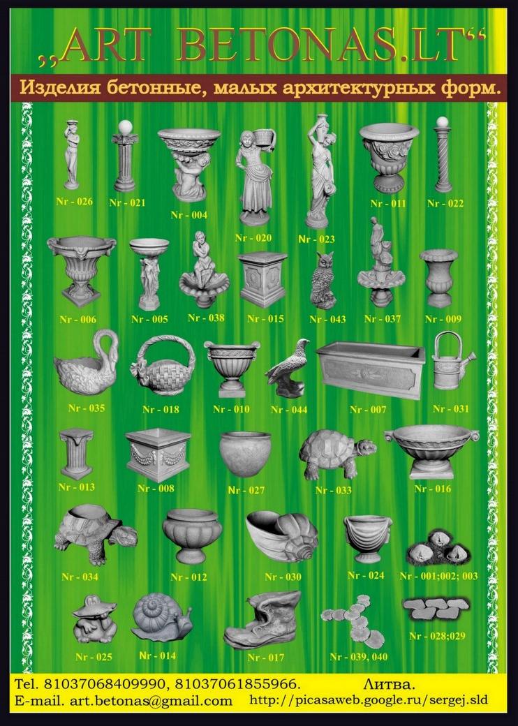 Экстерьер. Изделия из бетона.Малые архитектурные формы. Скульптурная мастерская ART BETONAS.LT (Литва,Вильнюс). Художественные изделия интерьера и экстерьера. Внешний,внутренний и садовый дизайн строений.Фонтаны,цветочные вазы,скульптурные изображения людей и животных,колонны и т.д. Изделия производятся на основе мраморных смесей и высококачественного белого цемента (AALBORG WHITE), выдерживающих влажность и холод. Весь ассортимент и цены - http://picasaweb.google.ru/sergej.sld |