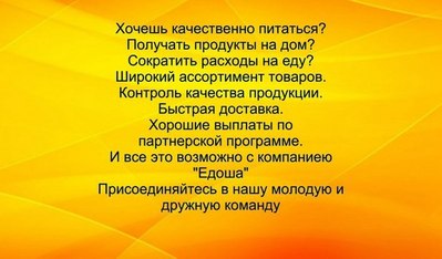 Хочешь качественно питаться? Получать продукты на дом и на работу? Сократить расходы на еду? Широкий ассортимент товаров. Контроль качества продукции. Быстрая доставка. Хорошие выплаты по партнёрской программе. Ешь – Рассказывай – Зарабатывай! Это и многое другое возможно только с компанией «Едоша». Присоединяйтесь в нашу молодую и дружную команду! Детально на www.edosha.ru Мой рег.№1662233 |