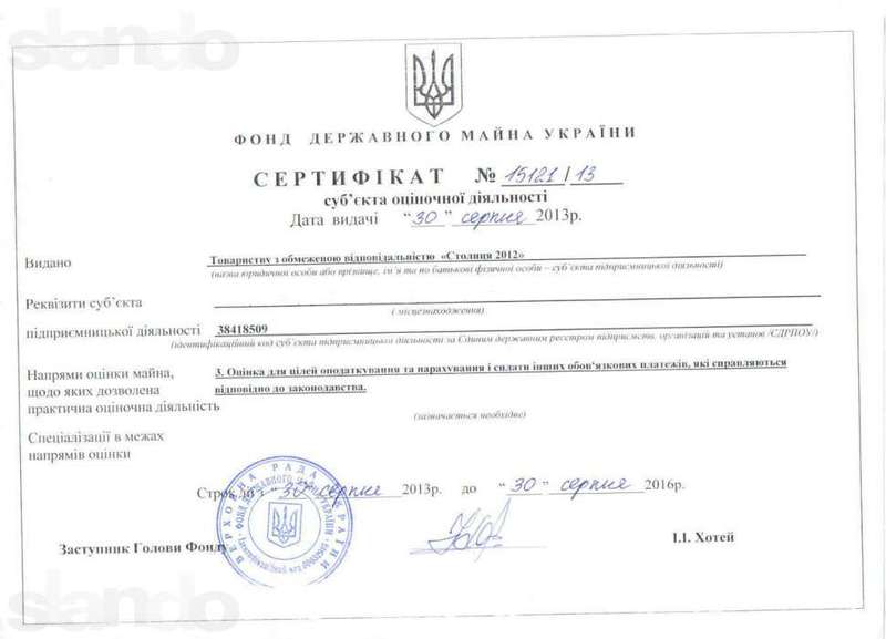ТОВ «Столиця 2012» пропонує послуги в області оціночної діяльності. ТОВ «Столиця 2012» є Суб'єктом Оціночної Діяльності затвердженим Фондом державного майна України, на відповідність знань у сфері оцінки майна, майнових прав та професійної оціночної діяльності. Сертифікат СОД №15121/13 від 30.08.2013р. Ми маємо в своєму штаті високодосвідчених оцінювачів, які пройшли підготовку за напрямом "Оцінка для цілей оподаткування та нарахування і сплати інших обов’язкових платежів, які справляються відповідно до законодавства". Напрями оціночної діяльності •Оцінка нерухомості •Колісних транспортних засобів •Рухомого майна •Майнових прав •Цілісних майнових комплексів Цина вид 300 грн. |