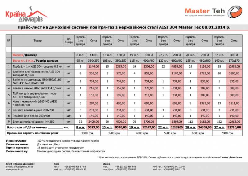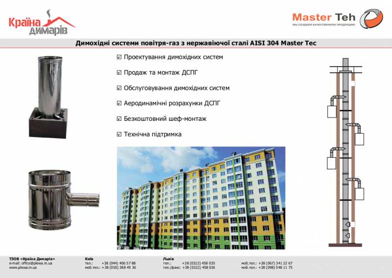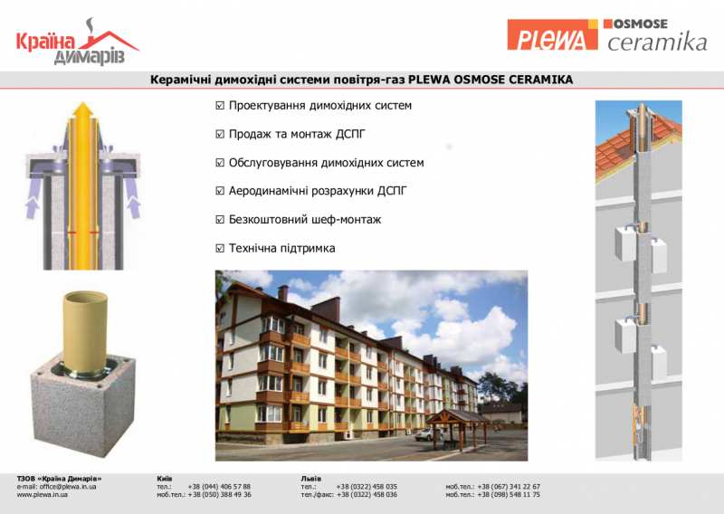 В каталоге нашей компании представлены дымоходные системы ведущих украинских и европейских производителей. Среди которых керамические дымоходы PlewaOsmozCeramika, дымоходы из нержавеющей стали Master Tech и прочие.