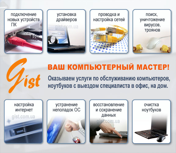 Джіст - професійна допомога Вашому комп'ютеру! Надаємо послуги з обслуговування комп'ютерів (ноутбуків) з виїздом фахівця в офіс, додому. Обслуговуємо Київ 24 години на добу. Без вихідних (ціни такі ж, як і в будні)! Оплата погодинна. Мінімальний виклик - 1 година. Ви можете безкоштовно проконсультуватися у наших IT-фахівців про можливі варіанти вирішення проблеми з ПК. Телефонуйте! gist. com. ua |