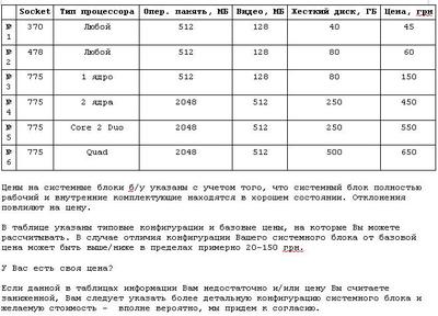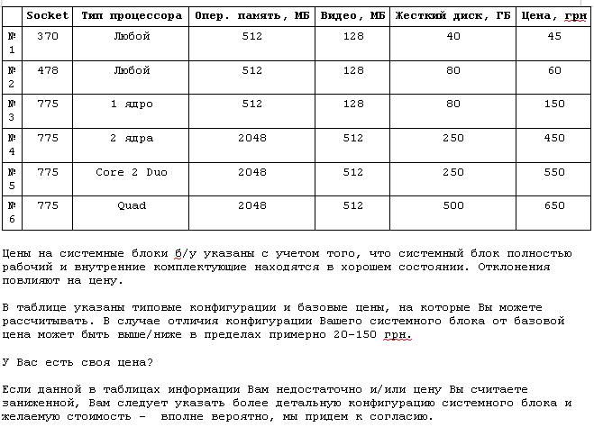 Выкупаю РАБОЧИЕ системные блоки на базе Socket 370, Socket 478, Socket 775 с любым процессором, с любым типом памяти, в любой комплектации. ПОКУПАЮ ТОЛЬКО РАБОЧИЕ СИСТЕМНЫЕ БЛОКИ. Деньги плачу СРАЗУ при покупке. Сам приеду и заберу - т.е. вам не придется никуда ехать. Покупаю по разумной цене. "Топовые" конфигурации не интересуют. Ориентировочные цены на б/у компьютеры смотрите во вложении. По вопросам оценки вашего компьютера - обращайтесь на почту baryshivka@at.ua, с указанием конфигурации (сокет, процессор, оперативная память (Mb), видео (Mb), жесткий диск (Gb)).