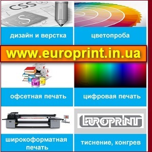 Реклама, полиграфия, упаковка 2014 Компания «ЕВРОПРИНТ» предлагает: Полиграфические услуги по дизайну и допечатной подготовке макетов. Качественная офсетная печать, все виды постпечатных работ. Изготовление бланков, листовок, флаеров, блокнотов, буклетов, визиток, пакетов, бланков, конвертов, папок, бумажной упаковки: мешков, коробок, календарей, кубариков, открыток, планнингов. +38(044)3629647 +38(096)1164633 +38(093)7418218 Киев, ул. Автозаводская, 18 www.europrint.in.ua |